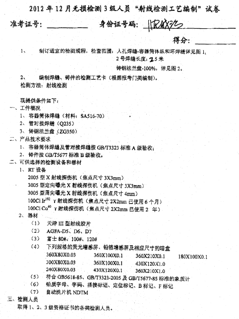 學(xué)會(huì)3級(jí)工藝卡試卷-射線