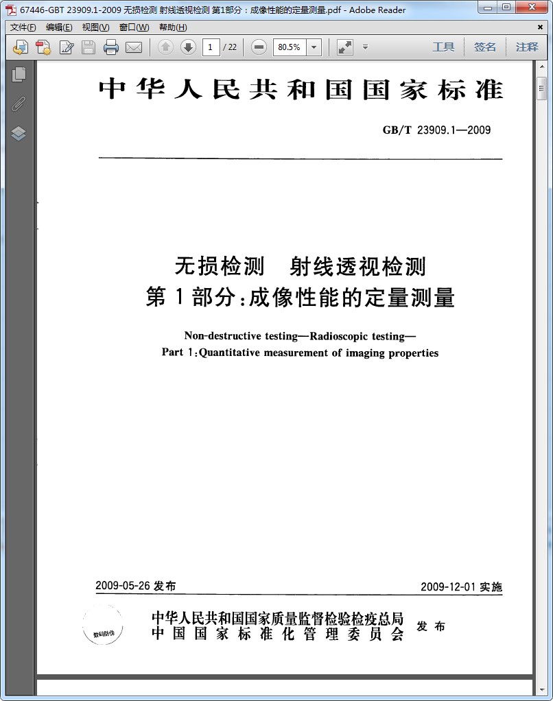 標(biāo)準(zhǔn)名稱: 無損檢測 射線透視檢測 第1部分:成像性能的定量測量