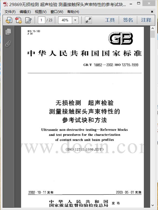 [GB/ T 18852-2002]無損檢測 超聲檢驗 測量接觸探頭聲束特性的...