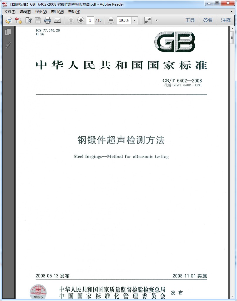 [GB/T 6402-2008]鋼鍛件超聲檢測方法