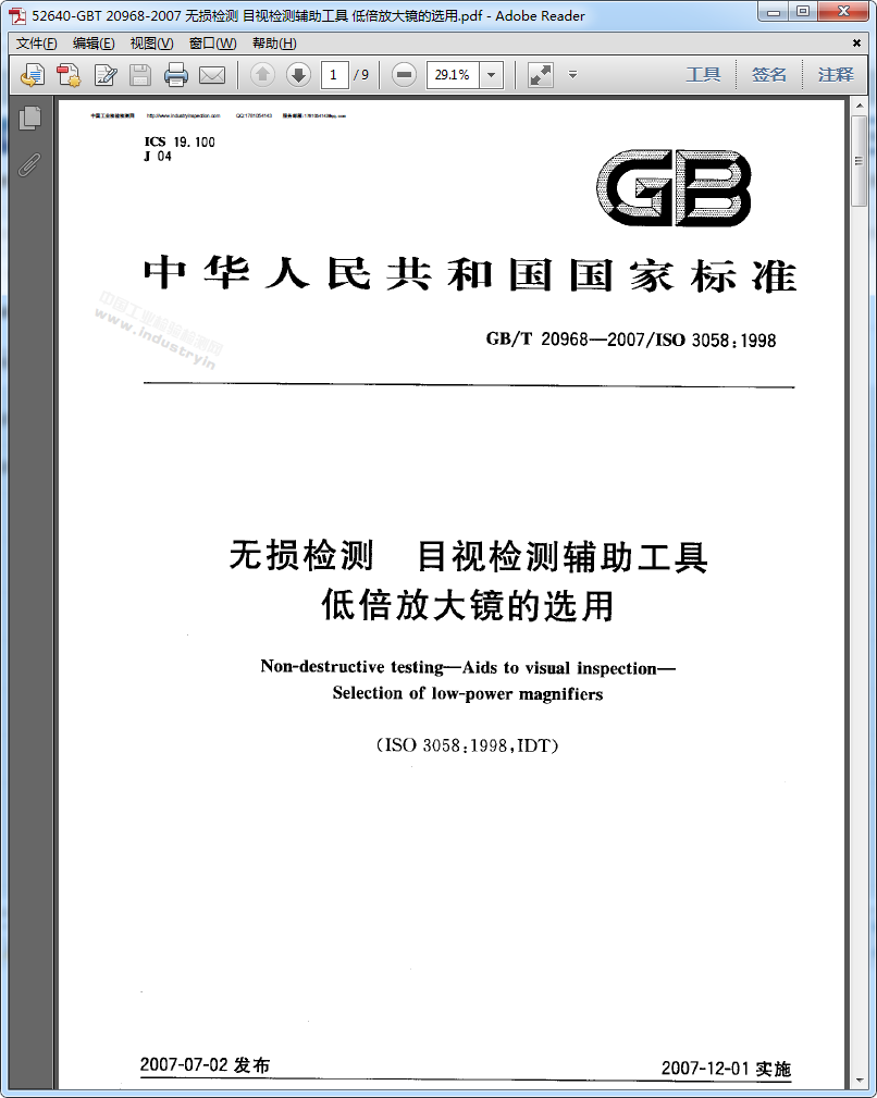 [GB/T 20968-2007]無損檢測 目視檢測輔助工具 低倍放大鏡的選用