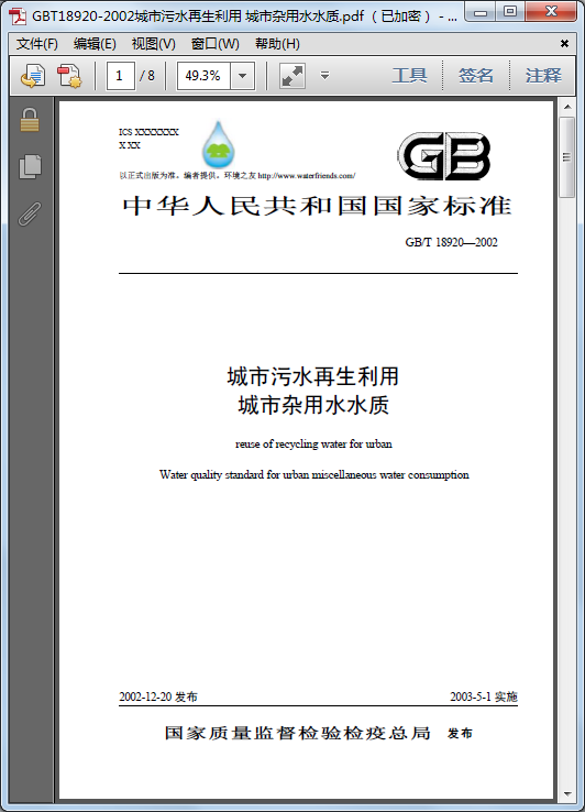 [GB/T 18920-2002]城市污水再生利用 城市雜用水水質