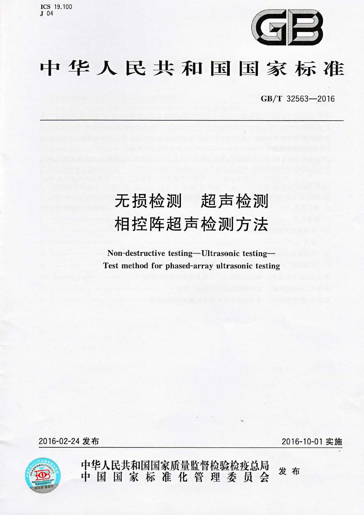 更新:GB/T32563-2016 相控陣超聲檢測方法【附PDF版,可下載】